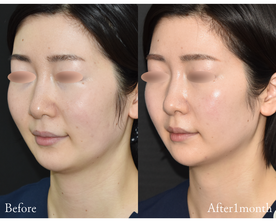 ファットエックスコアをフェイスラインへ1回(10cc)、あご下へ2回(合計20cc)注入し1ヶ月後にボルニューマ+ハイフを受けた当院スタッフの症例です。